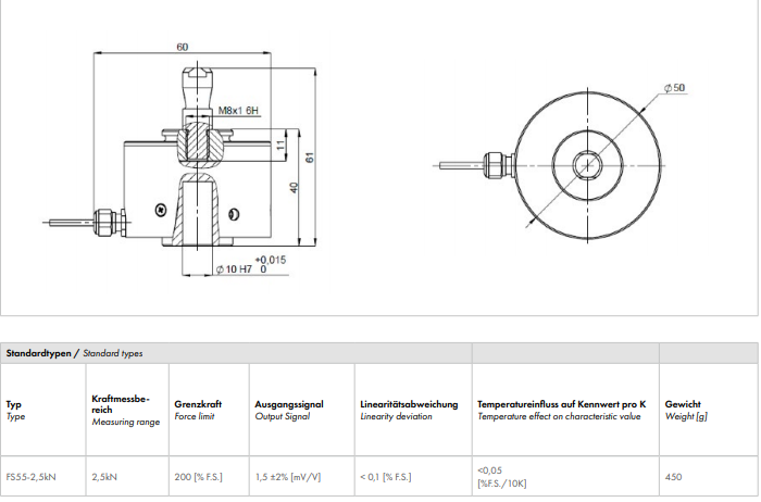 受力方向:压力受 力测量范围:2.5 kN 输出信号:1.5±2%[mV / V] 线性偏差:<±0.1 [%FS] 温度系数:<0.05 [%FS / 10K] 防护等级:IP65 额定温度范围: -20 .. +60 [°C]